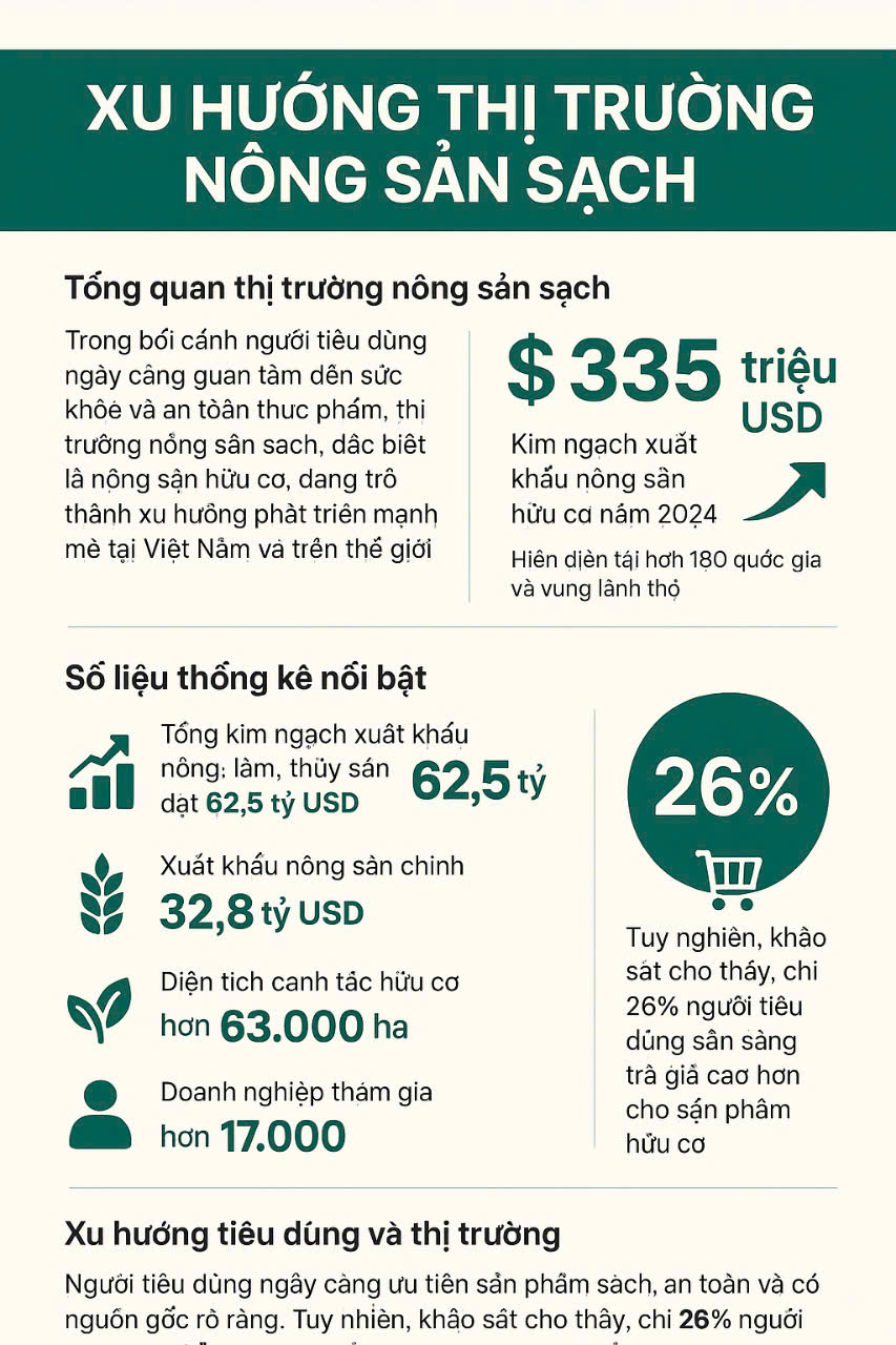 Trong kỷ nguyên mà sức khỏe và chất lượng sống được đặt lên hàng đầu, nông sản sạch – đặc biệt là nông sản hữu cơ – không chỉ là một lựa chọn mà đang trở thành nhu cầu thiết yếu. Theo Bộ Nông nghiệp & PTNT, năm 2024, Việt Nam đã xuất khẩu hơn 335 triệu USD nông sản hữu cơ, với mạng lưới trải dài khắp 180 quốc gia.